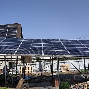 Сонячна станція 30 кВт під Зелений тариф з розташуванням сонячних панелей на покрівлі та навісної конструкції з діагональним кутом нахилу